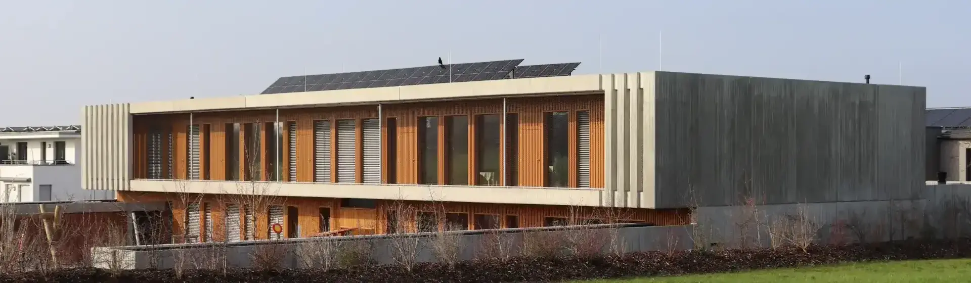 Ein 3-geschossiger Neubau für 60–65 Betreuungsplätze in Massiv- und Holzbauweise – fertiggestellt in nur einem Jahr. Die serielle Vorfertigung der Holzmodule verkürzte die Rohbauzeit von sechs auf vier Monate.
